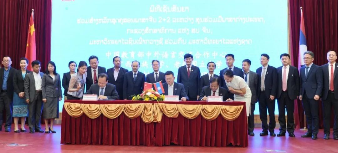 4月26日,在老挝教育体育部部长普·西玛拉翁、中国驻老挝大使姜再冬、中国广西壮族自治区教育厅副厅长李清先的见证下,中国教育部中外语言交流合作中心主任马箭飞与老挝国立大学校长乌冬·鹏坎平、广西民族大学校长